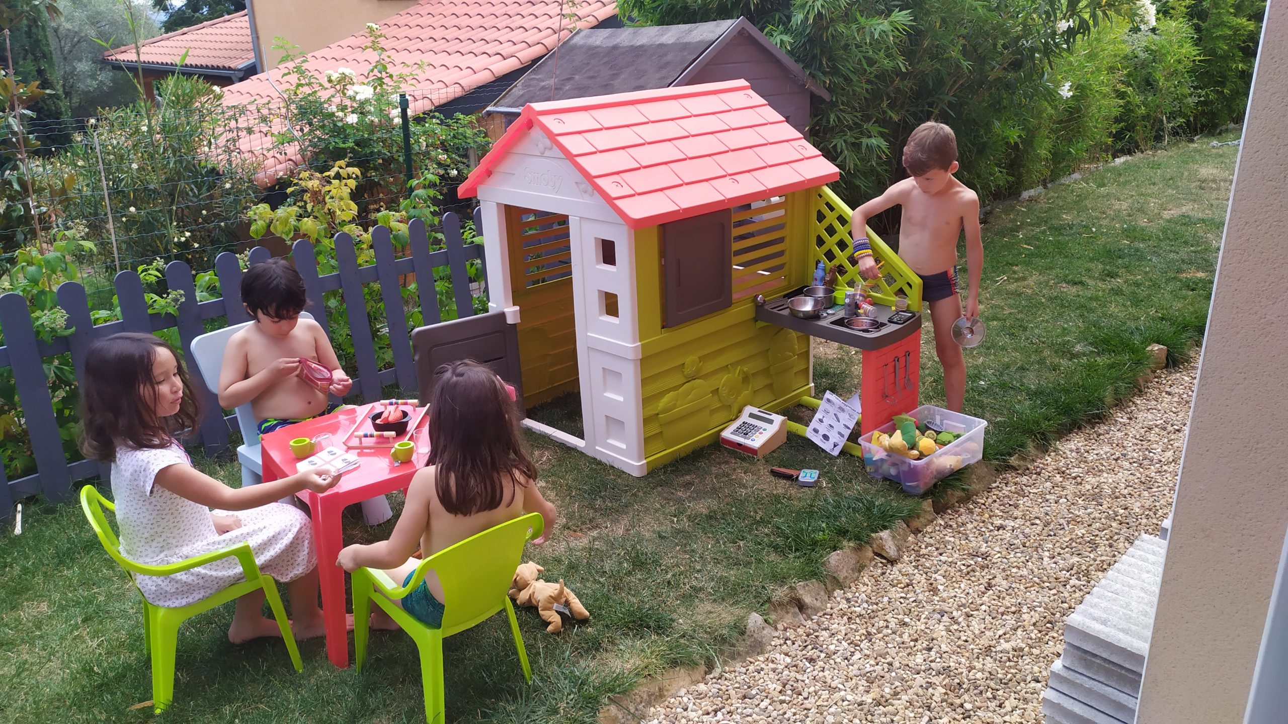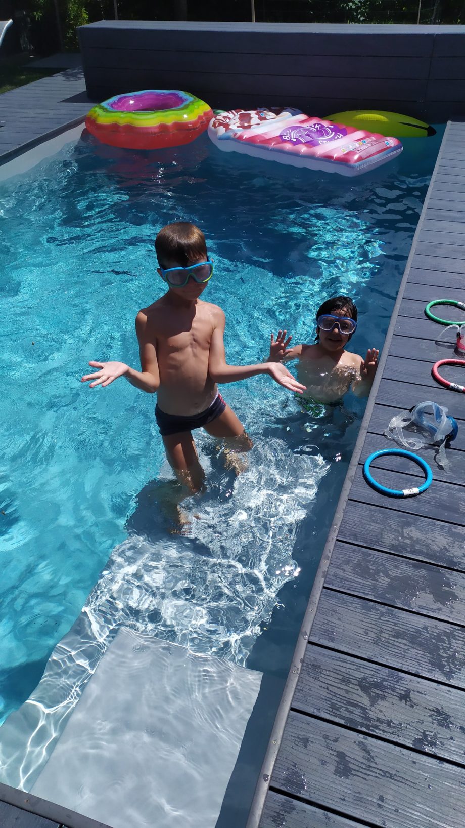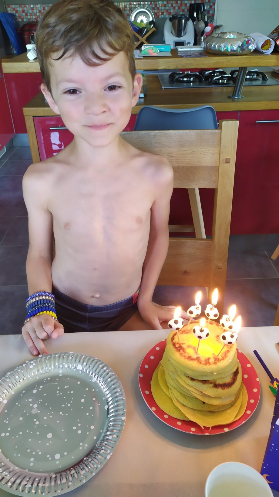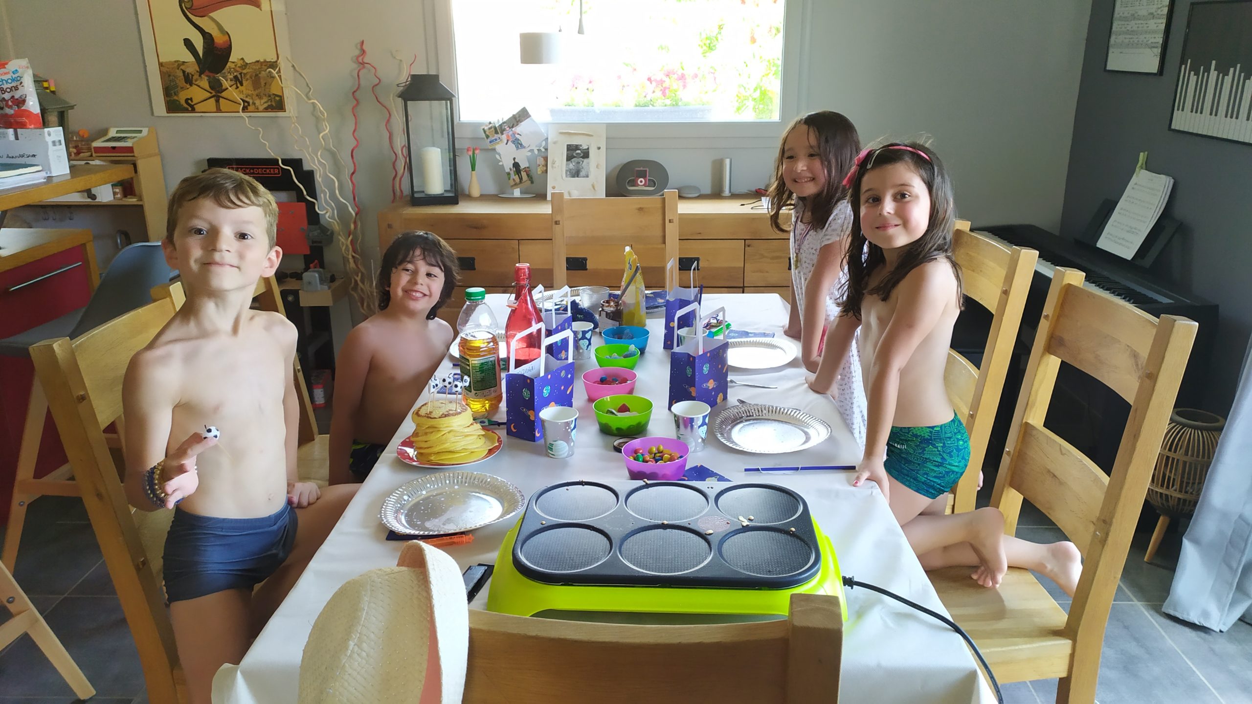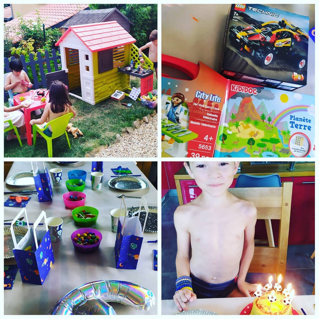 Coronavirus oblige, nous avons fait en petit comité cette année. Léandre a choisi son meilleur copain Elian, sa chérie Chloé et la petite voisine Maïlane. Piscine, trampo, cuisine, crêpes party ça s’est super bien passé !