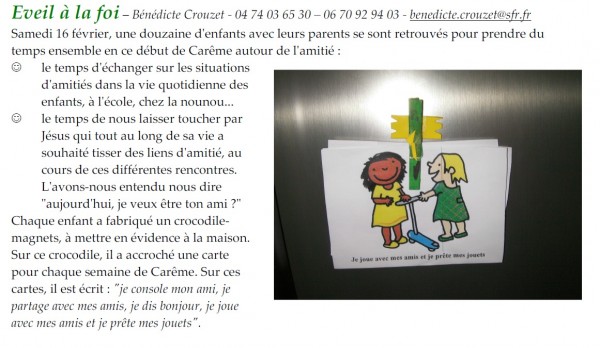 Louise étant encore trop petite pour aller au cours de catéchisme, la paroisse d’Anse propose plusieurs fois par an, des séances d’éveil à la foi. Quelques heures le samedi matin, avec un parent, pour aborder de façon ludique les valeurs de l’église.