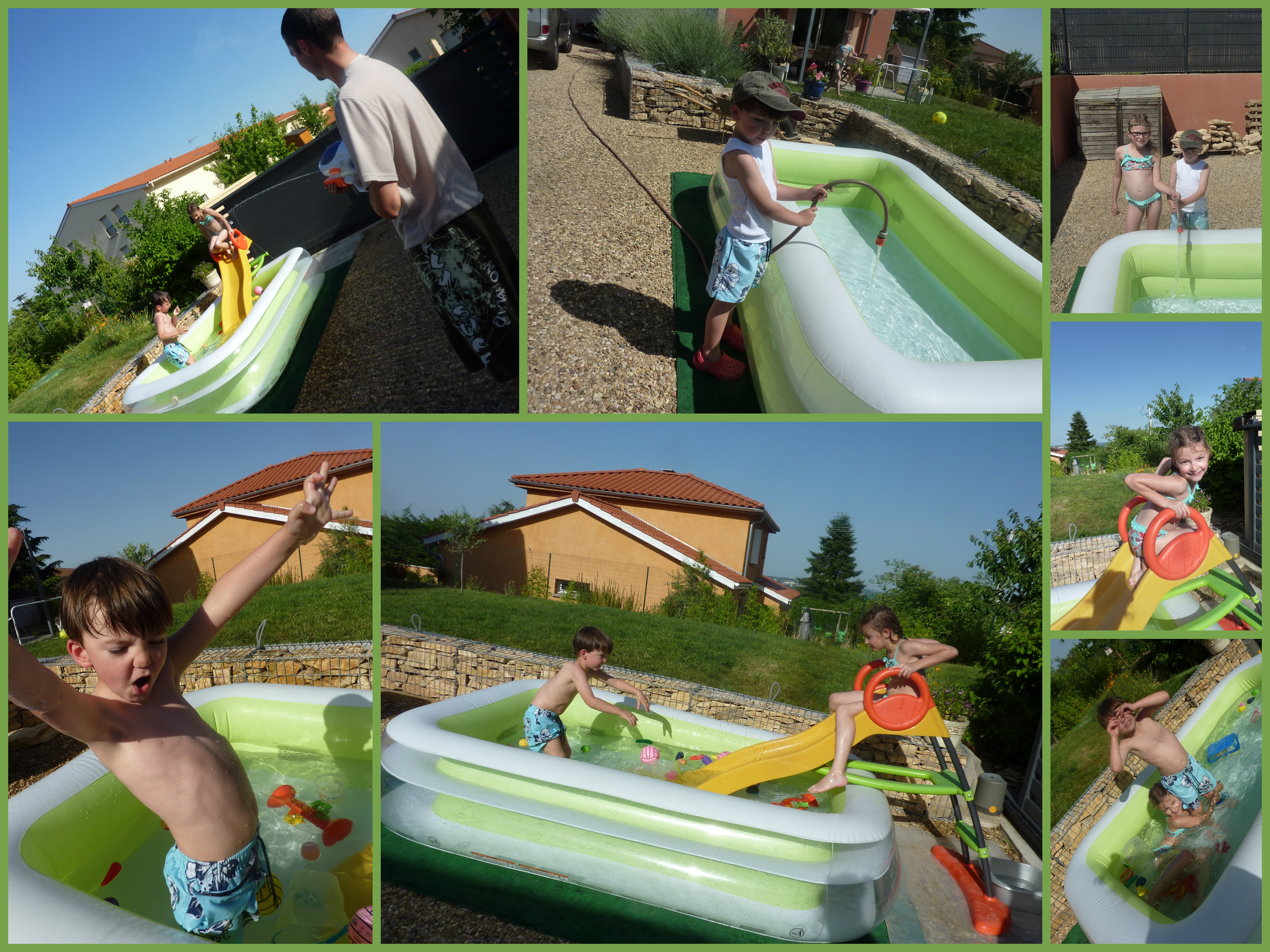 Grosses chaleurs annoncées pour quelques jours, Franck et Marceau ont donc gonflé et rempli la piscine ce matin ! L’eau a chauffé très très vite, les enfants ont déjà pu se baigner en fin de matinée et en fin d’aprem ! ça les a bien rafraîchit avec les 34°C atteints dans l’après-midi !!!