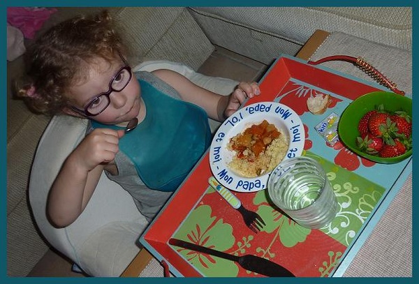 L’allaitement pour un 2ème enfant, c’est tout de suite un peu plus compliqué car il faut gérer le 1er !!! Donc pour que cela ne vire pas au mélodrame en pleine têtée (« J’ai faim… je veux un DVD… je veux mon doudou… je veux tout ce que je ne peux pas attrapper… »), je demande à Louise tout ce qu’elle veut avant de commencer !!! Et comme la têtée tombe souvent sur l’heure des repas, je lui prépare son petit plateau avec tout son repas, comme ça elle a tout sous la main & elle est juste à côté de moi en cas de dégat ! Et elle est toute contente !