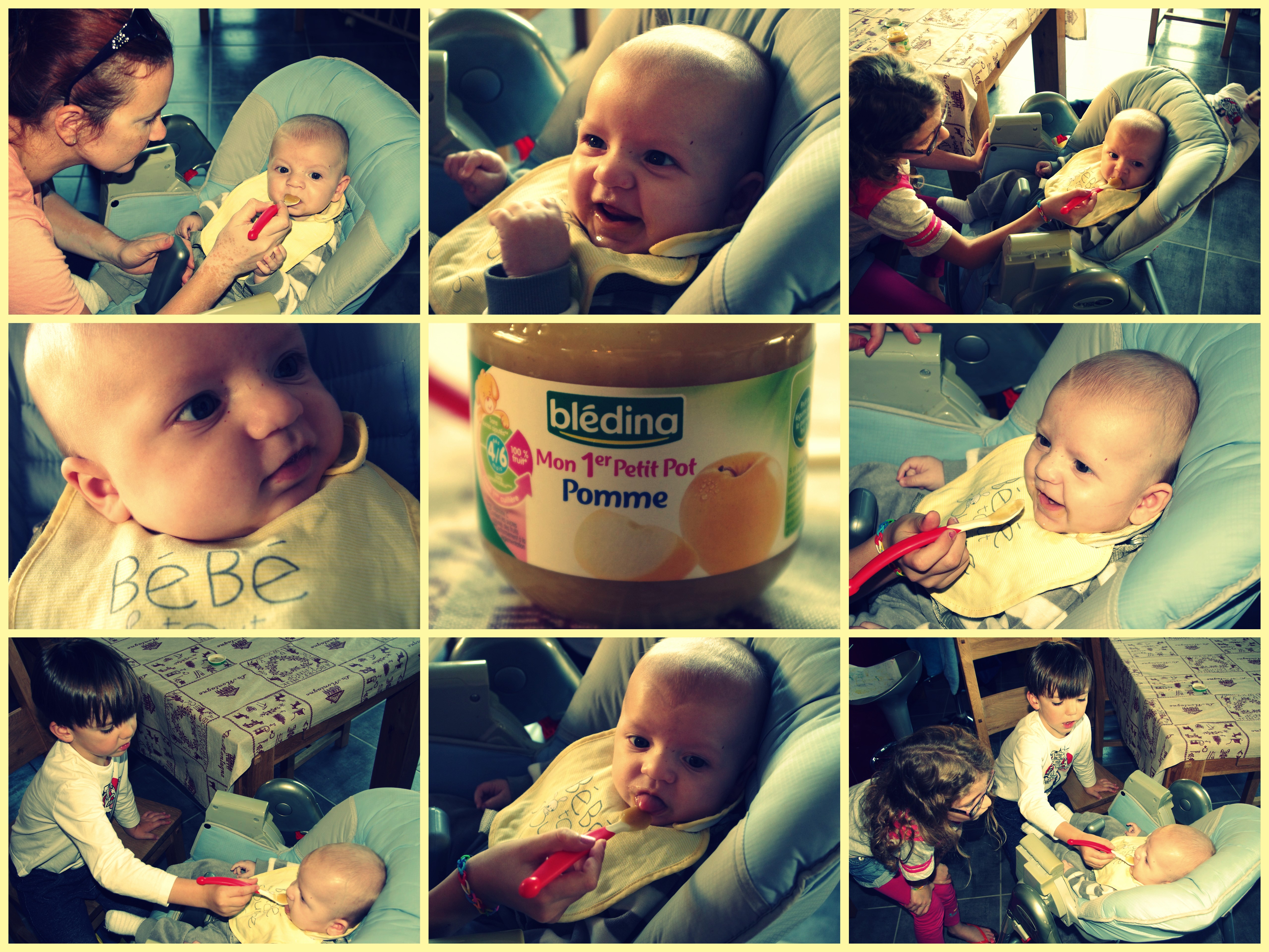 Après conseils du pédiatre, nous avons donné à Léandre aujourd’hui ses 1ères cuillères de compote. Pas hyper emballé mais ça viendra ! Tout le monde a voulu lui donner à tour de rôle, c’était la bataille !!!