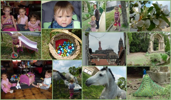 Nous avons profité pour aller voir les animaux de la ferme (comme à chaque fois…!), donner à manger aux beaux chevaux gris, rendre visite à Jallila & Shainess deux petites cousines éloignées de Louise, faire un tour au Puy, manger des crêpes, acheter du tissu pour des gigoteuses d’été de Marceau, chercher les oeufs que les Cloches avaient laissés dans le jardin (depuis le week-end de Pâques !!!), aller à la piscine une nouvelle fois… enfin on s’est pas ennuyées !!!