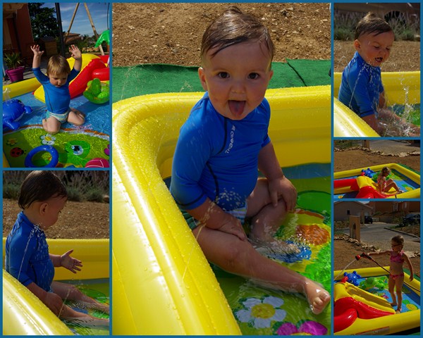 On a pris une petite pataugeoire avec toboggan pour que Marceau puisse s’asseoir dedans et en profiter aussi ! En + y’a un petit système de jets d’eau intégré dans la bouée, donc je vous dis que ça rigole !!!
