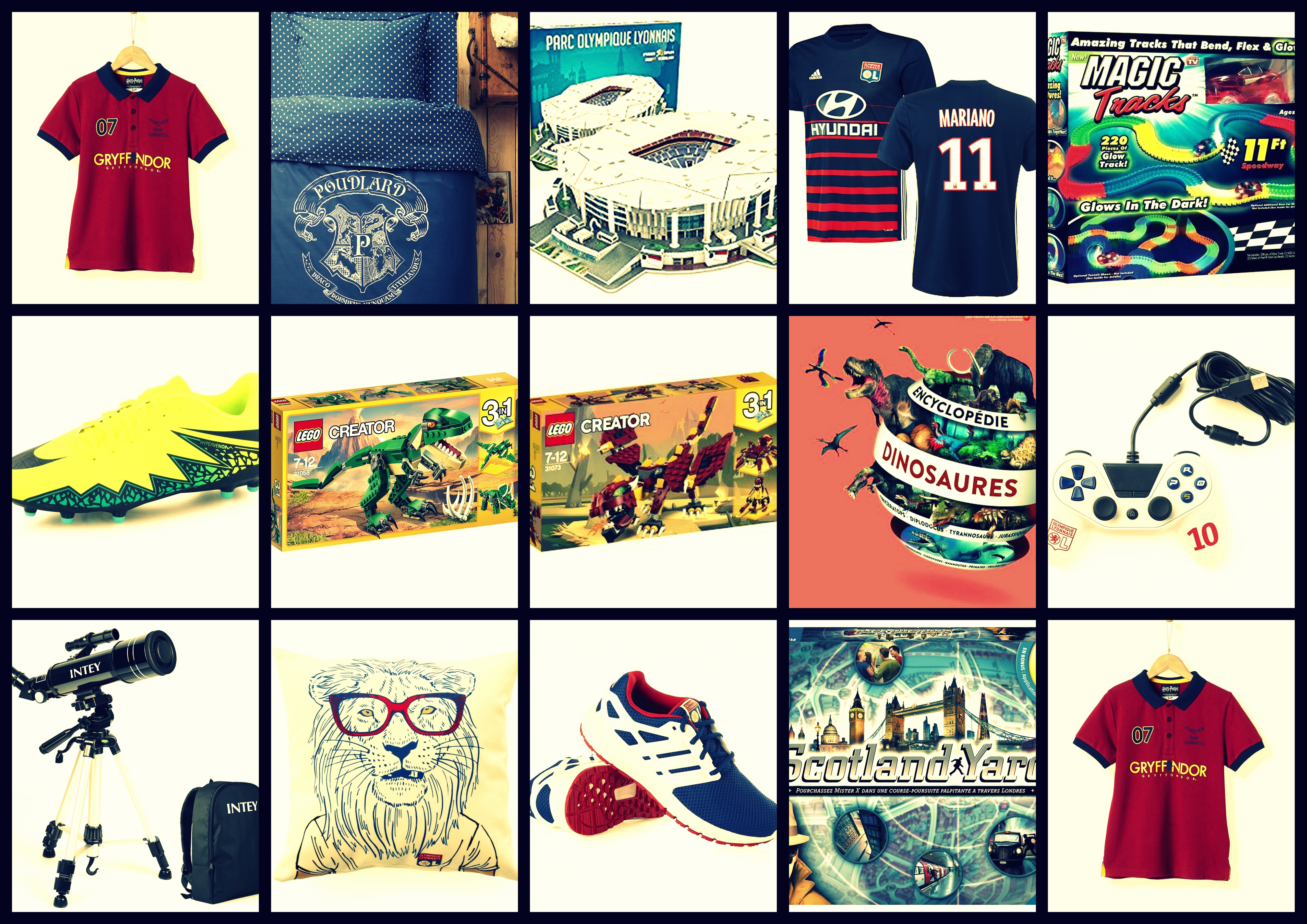 Voici ce à quoi j’ai pensé pour son anniversaire, certaines choses sont souhaitées, d’autres des surprises ! Un polo Gryffondor Cyrillus collection HP, une parure de drap HP chez Cyrillus, la maquette du Parc OL, le maillot de Mariano, des magic tracks, des chaussures de foot en 36 pour la saison prochaine, des Lego Creator dinosaures, l’Encyclopédie des dinosaures chez Gallimard, une manette PS4 OL, un nouveau jeu de PS4, un téléscope, un coussin OL, des baskets Adidas collection limitée OL, le jeu Scotland Yard ou Mystères de Pékin.