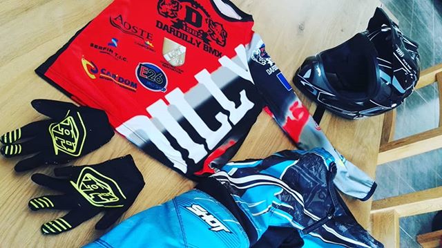 Équipement bmx pour Léandre… Casque et gants achetés neuf car difficile de trouver de petites tailles et on ne sait pas trop ce que le casque a vécu avant. Pantalon et t-shirt du club acheté d’occase au club… Car neuf ça chiffre très très vite !!!