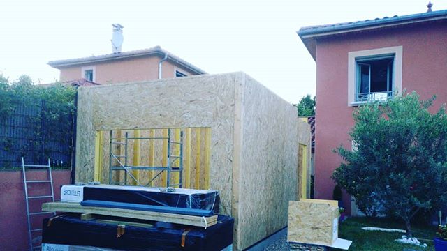 Montage du garage ossature bois en cours… (sera crépi de la même couleur que la maison ensuite)
