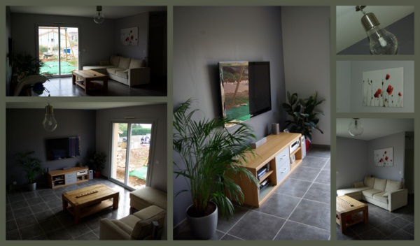 Et voici notre grande pièce du RDC, côté salon… La peinture (toujours les 2 tons de gris) a été faite par Franck & le nouvel écran plasma accroché au mur (et les câbles dans le mur). A terme, le canapé sera changé, pour 2 canapés plus petits, que nous mettrons perpendiculairement. Cela « clôturera » plus le …