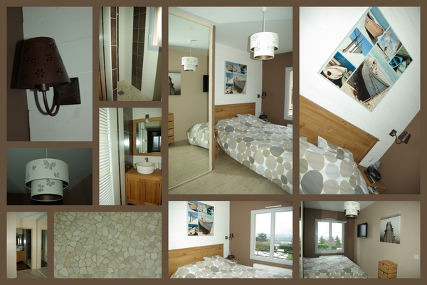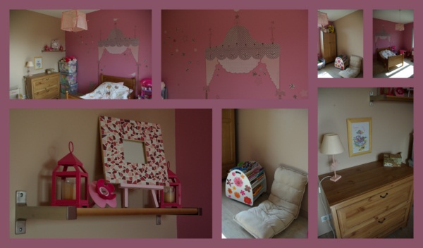 Voici la chambre « parents » ! Difficile à prendre en photo car tout en longueur… Au sol toujours le même parquet. Au mur : du lambris « blanc cassé » sur la tête de lit avec chevets intégrés, et deux murs beige / deux murs chocolat. Nous avons un grand placard, aménagé chez Ikéa & des portes vitrées …